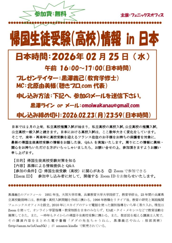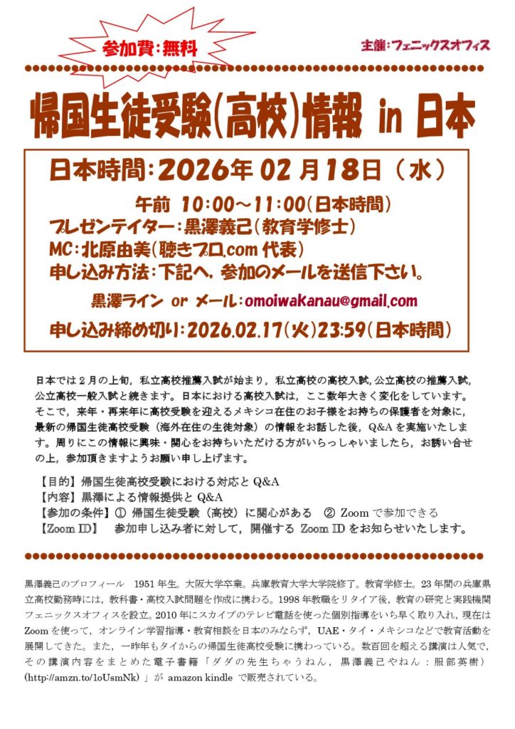 ご縁のあった海外駐在の保護者の方へ,少しでもお役に立てればとの思いから,メキシコとフランス在中の方を対象に,帰国生徒高校受験についての詳しい情報と対策を黒澤が話すことになりました。興味ある方にとって,いい機会になることを心から願っています。